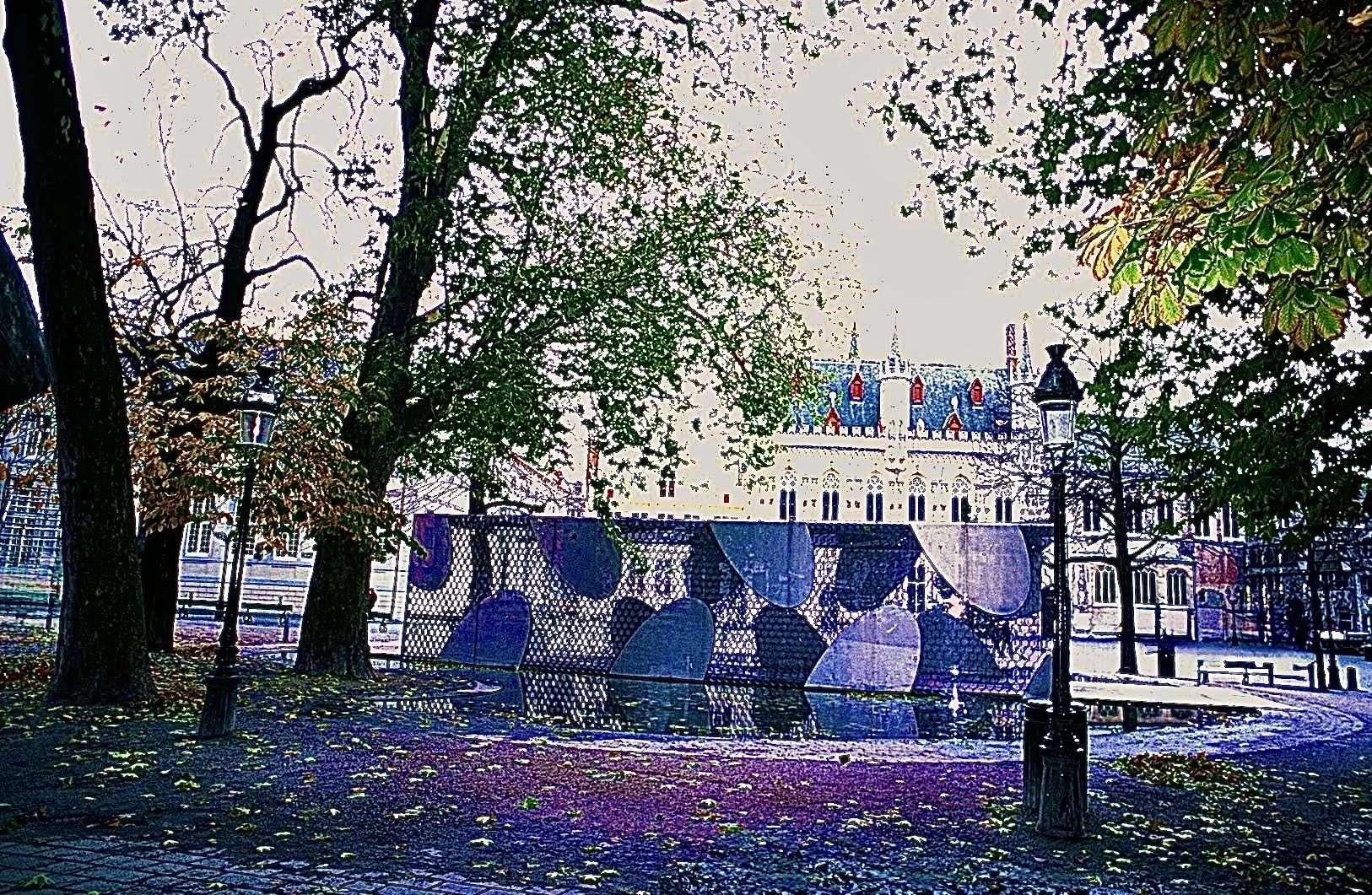 Slowly the train winds down and through The Hague: Later at maximum speed I land in Belgium’s Bruges: My final but lasting destination is Toyo Ito’s Pavillion: Against the backdrop of the Bruges City Hall I realized that 256 km or 150 miles flashes by like cheat notes in a debate: